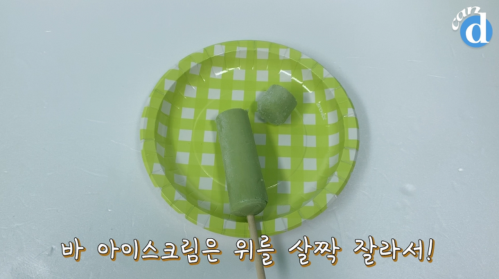 녹차 아이스크림 윗부분 잘라서 계란과자랑 먹어봤어요.