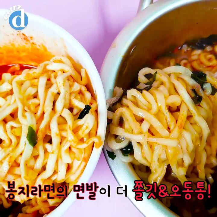 봉지라면의 면발이 더 오동통하고 쫄깃했어요.