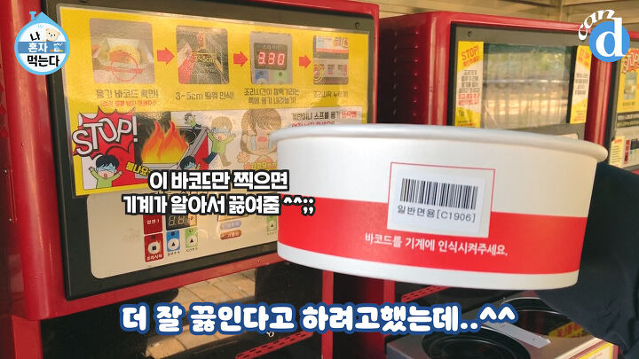 라면은 바코드를 찍고 용기에 라면, 스프를 넣은 뒤