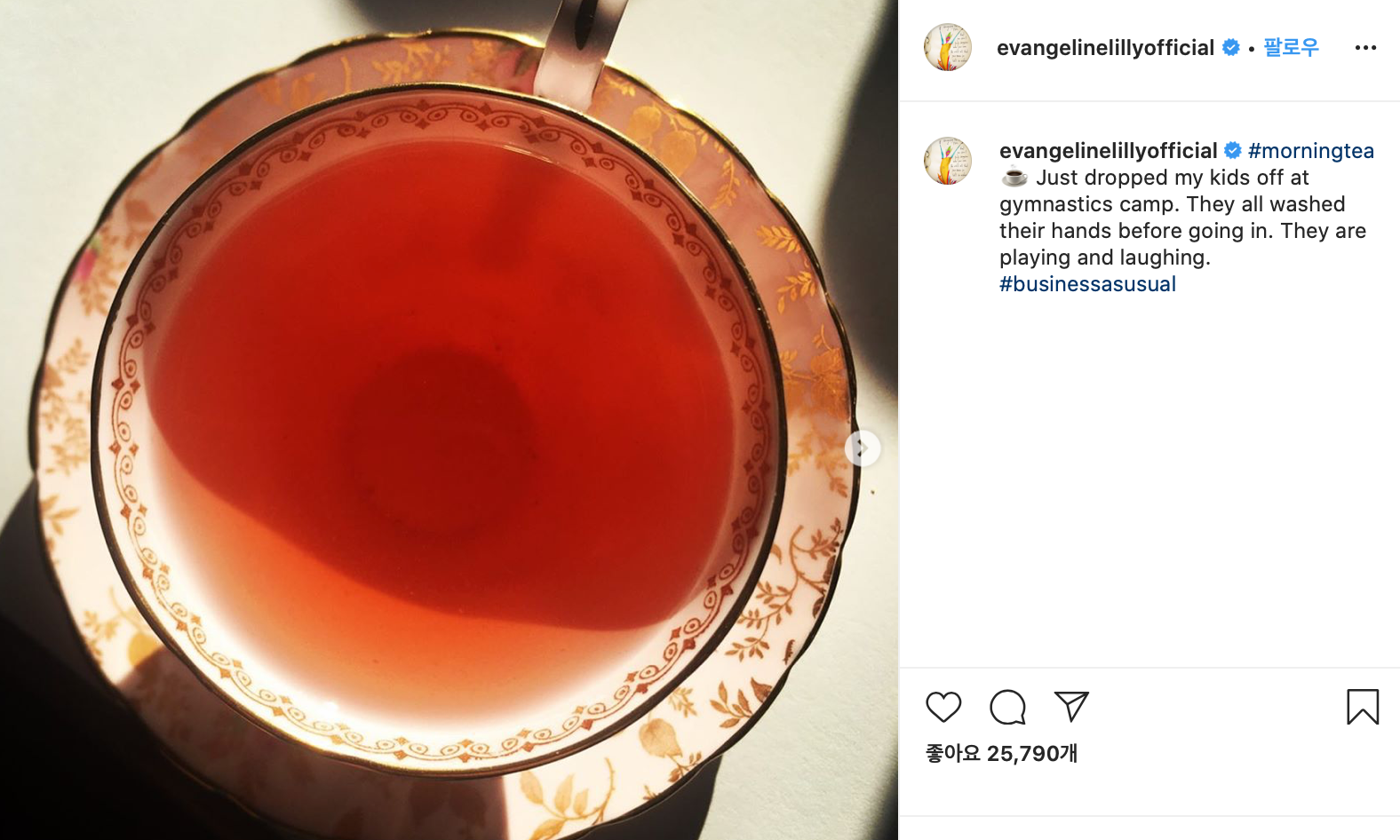 릴리는 지난 17일(한국 시간) 자신의 인스타그램에 “아이들을 체조 캠프에 데려다줬다. 나가기 전 모두 깨끗이 손을 씻었다”고 말했다.