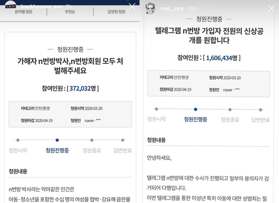 찬열도 "텔래그럼 n번방 가입자 전원의 신상공개를 원합니다"라는 문구가 담긴 청원 게시판을 공유하며 힘을 실었다.