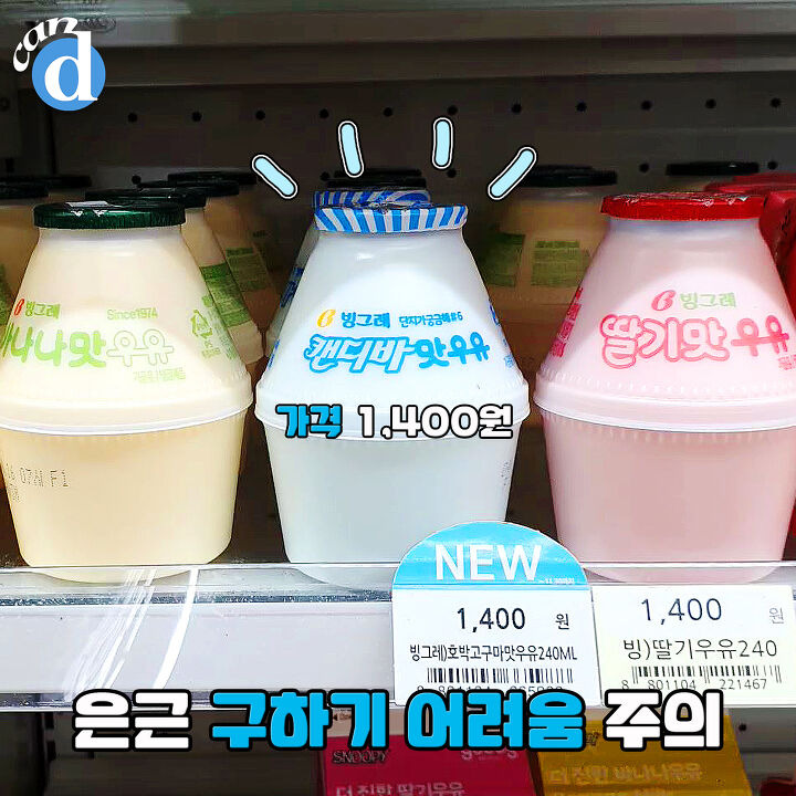 캔디는 편의점에서 1,400원에 구입했어요. 빙그레 단지우유의 가격은 동일해요. (거짓말 안하고 이틀만에 구해봄ㅠㅠ)