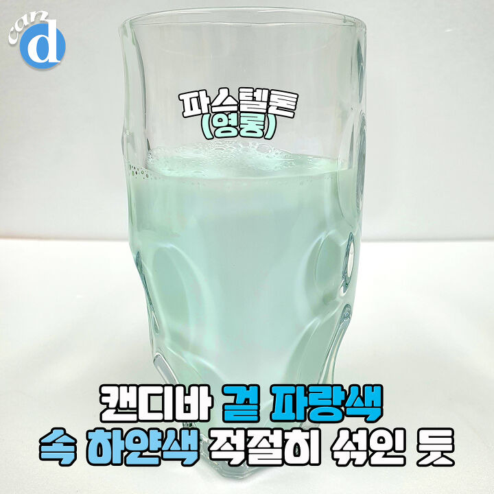 컬러는 캔디바 겉의 파란색(소다맛 샤베트)과 속의 흰색(달달한 우유)이 잘 섞인 빛깔이에요.