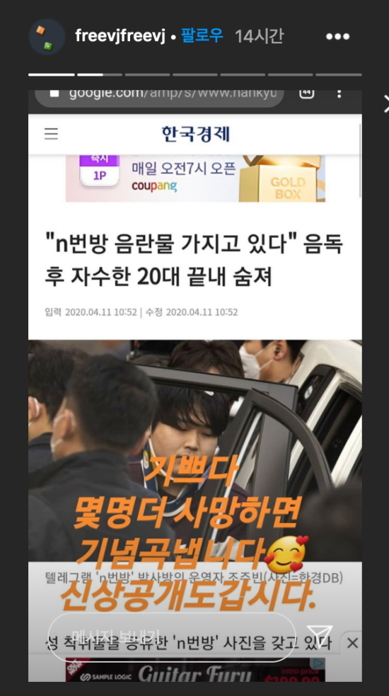 버벌진트는 13일 자신의 SNS 계정에 ’n번방’ 피의자 사망 기사를 캡쳐해 공개했다. “기쁘다”고 사망 소식을 전했다.