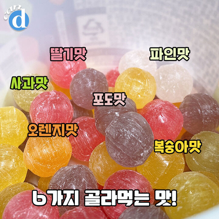 맛은 총 6가지에요. 딸기맛, 사과맛, 포도맛, 복숭아맛, 오렌지맛, 파인애플맛.