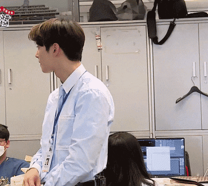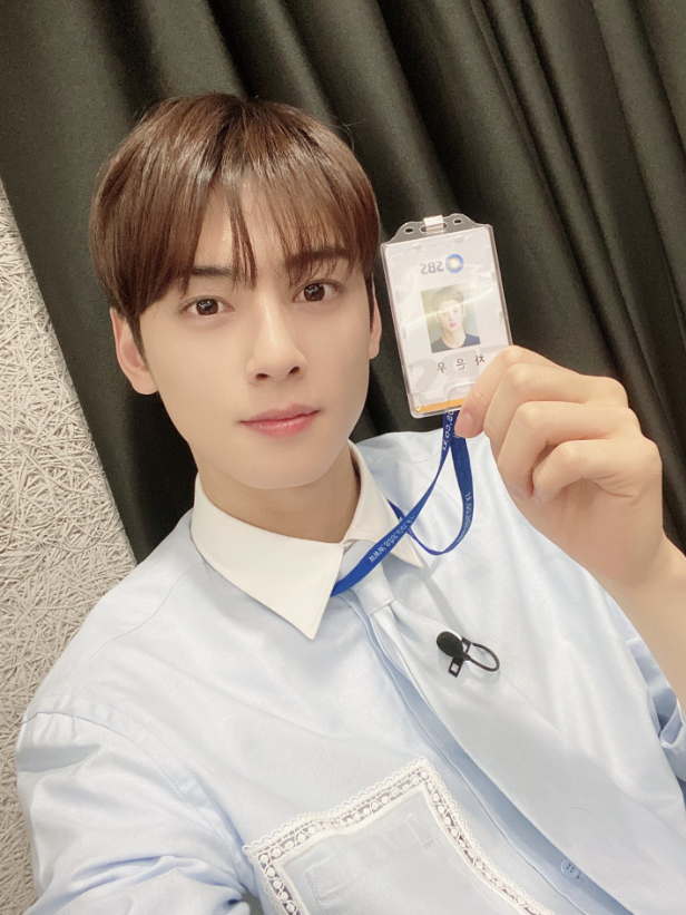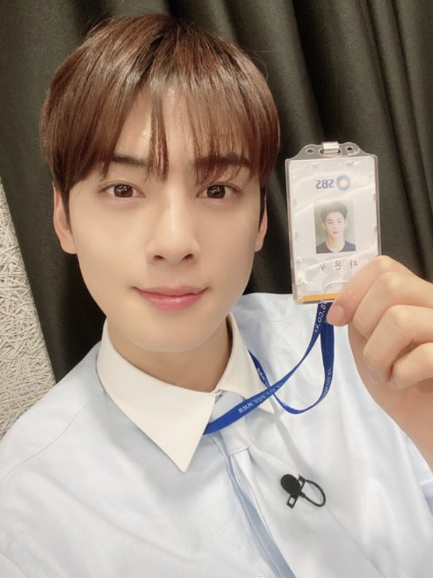 차은우는 눈부신 미모로 감탄사를 불러 일으켰습니다. 수려한 조각 미모에 셔츠와 팬츠가 잘 어울렸죠. 목에 건 신분증마저 화보였습니다.