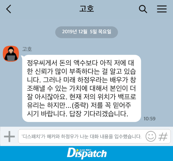 해커 : 정우씨게서 돈의 액수보다 아직 저에 대한 신뢰가 많이 부족하다는 걸 알고 있습니다. 그러나 미래 하정우라는 배우가 창조해낼 수 있는 가치에 대해서 본인이 더 잘 아시잖아요. 저를 꼭 믿어주시기 바랍니다. 답장 기다리겠습니다.