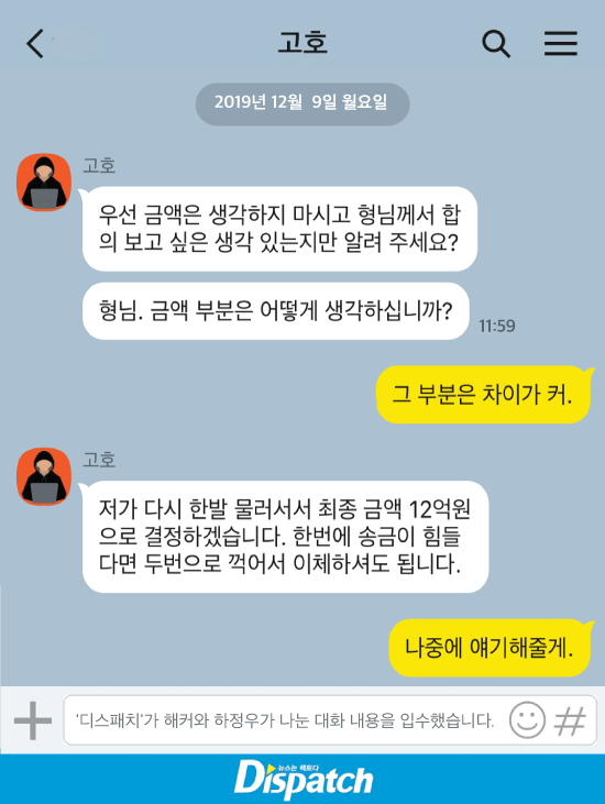 "우선 금액은 생각하지 마시고 형님께서 합의 보고 싶은 생각 있는지만 알려 주세요? 그 다음 금액에 대해서 얘기 합시다. 형님 휴식 하실때 편하게 회신주세요." (해커)
