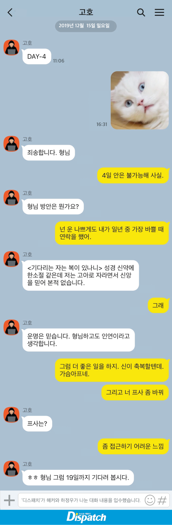 하정우는 4시간 뒤에 답했다. 오후 4시 15분이다.