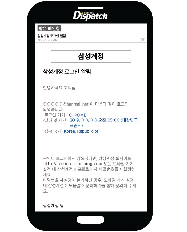 곧바로 이메일을 열었다. 편지함을 체크했다. 거기서 의문의 메일을 발견했다. '삼성계정 로그인 알림'이라는 메시지였다.