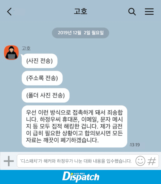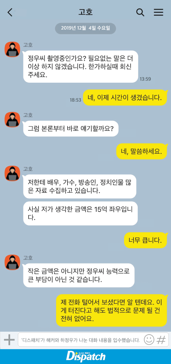 “우선 이런 방식으로 접촉하게 돼서 죄송합니다. 하정우씨 휴대폰, 이메일, 문자 메시지 등 모두 집적 해킹한 겁니다. 제가 금전이 급히 필요한 상황이고 합의보시면 모든 자료는 깨끗이 폐기하겠습니다. 하정우 씨 논리적이고 이성적인 분으로 알고있습니다. 서로에게 유리한쪽으로 협상합시다.”