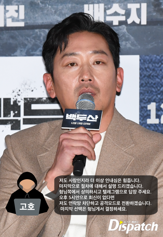 "솔직히 제가 분석한 하정우는 이성적이고 논리적인 분으로서 세무 조사 등 모든 문제를 쉽게 정리 할수있는 사람으로 판단 됩니다. 저도 준비한 계획을 미리 형님께 말씀 드리자면 12월 19일 <백두산> 개봉전까지 해결 방안이 없다면 합의는 없는 일로 하겠습니다."