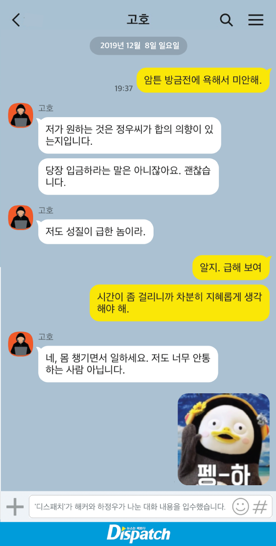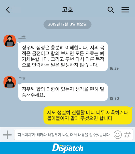 “정우씨 심정은 충분히 이해합니다. 저의 목적은 금전이고 합의 보시면 모든 자료는 폐기처분합니다. 그리고 두번 다시 다른 목적으로 연락하는 일은 발생하지 않습니다. 저를 한번만 믿어주시고 다시 고민해주시기 바랍니다.”