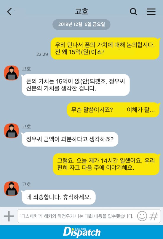 해커 : 폰의 가치는 15억이 않(안)되겠죠. 정우씨 신분의 가치를 생각한 겁니다.