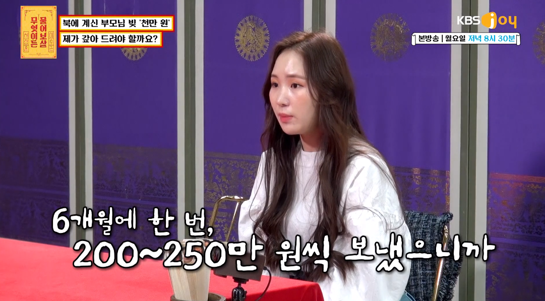 그녀는 "그 후 아빠는 드러눕고 폐인처럼 살고, 알코올 중독이 왔다. 그래서 술에 돈을 많이 썼다. 엄마 역시 잘 살던 씀씀이가 있어, 빚을 갚지 않고 보내준 돈을 써버린다"고 하소연했습니다.