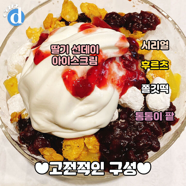 본격적으로 빙수 구성을 살펴볼게요! 가장 위에 딸기 선데이 아이스크림이 듬뿍 올려져있고요. 그 아래로 시리얼, 빙수떡, 팥, 후르츠가 옹기종기 모여 있어요.