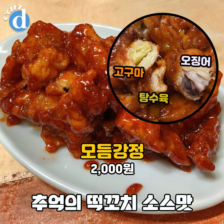 호호분식의 인기 사이드 메뉴 모.듬.강.정! 오징어+고구마+탕수육 3가지 튀김 종류입니다.