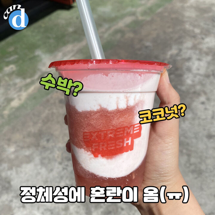 첫 입을 먹었을 땐, 캔디의 기대가 바사삭... 수박, 코코넛 둘 중 더 튀는 맛이 없었어요.