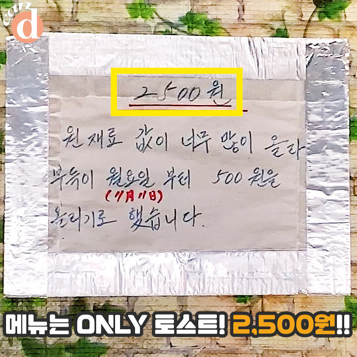 가격은 2,500원. 재료값 때문에 가격이 올라도 양은 그대로라는 이 집의 토스트 한번 만나볼게요!