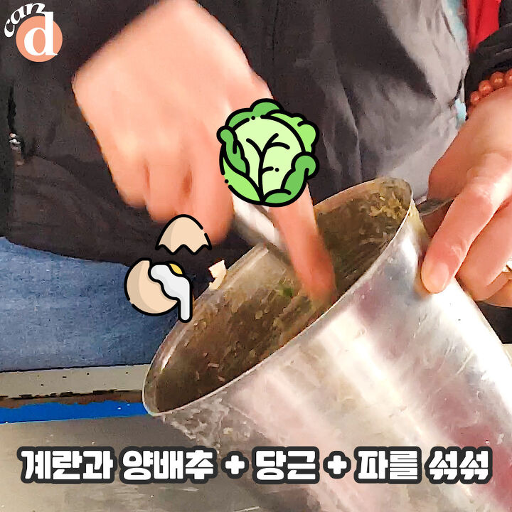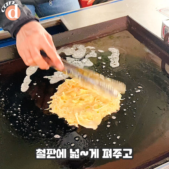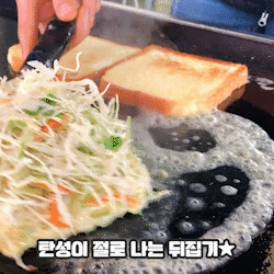 마가린을 듬뿍 바른 철판에 넓게 펴올려요. 계란과 철판이 만났을 때 '치익-' 소리는 잊을 수가 없어요.