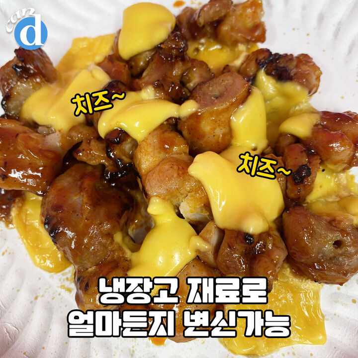 닭꼬치에 체다치즈를 살짜쿵 올려봤어요. 매콤소스X치즈의 조합은 사랑이죠♥