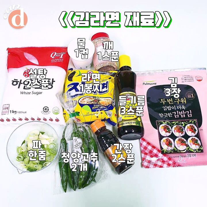 진라면 순한맛, 김 3장, 물 1컵, 간장 2/설탕 2/들기름 3/깨소금 1스푼 , 청양고추 2개, 대파 한줌