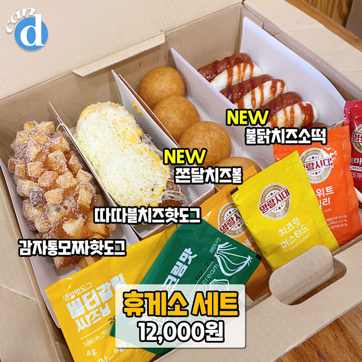 휴게소 세트의 가격은 12,000원! 인기 핫도그 2종 포함한 신상 치즈볼과 소떡소떡으로 구성되어 있어요.