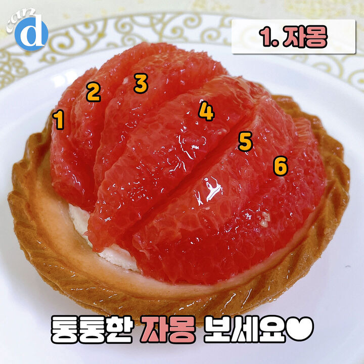 먼저 자몽타르트부터 살펴봤는데요. 통통한 자몽 6조각이 올라가있어요. 길이 역시 검지손가락 정도로, 만족끄~