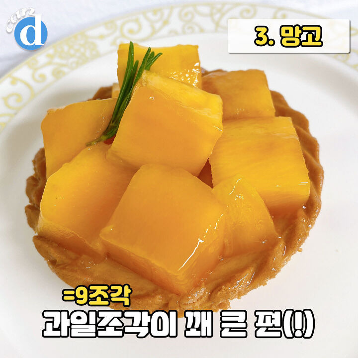 치즈 위에 무려 망고 9조각이 들어가있답니다. 작지만 귀여운 로즈마리 데코가 있어요.