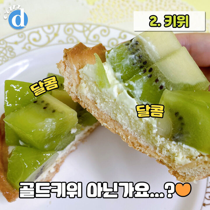 기다랗게 치즈 위에 올라간 자몽과는 달리! 네모난 모양의 키위 7조각이 올라가 있어요.