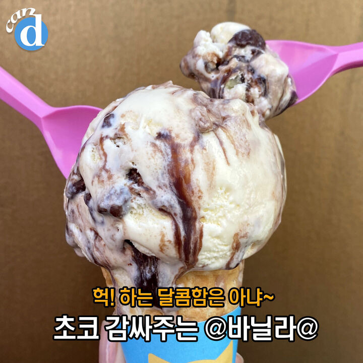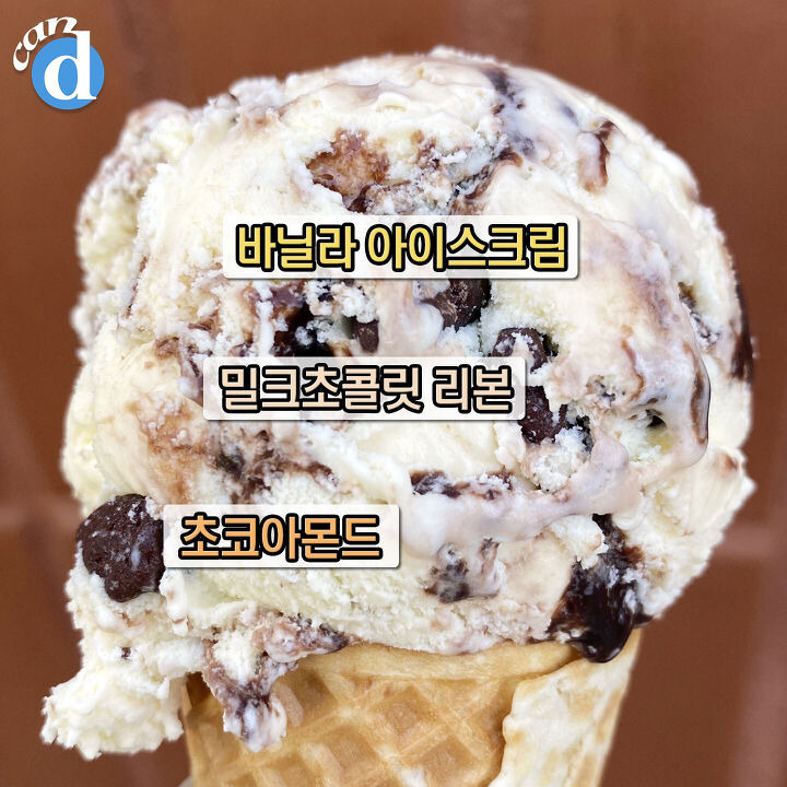 부드러운 바닐라향 아이스크림에 초콜릿 코팅 아몬드, 밀크 초콜릿 리본으로 구성되어 있어요!