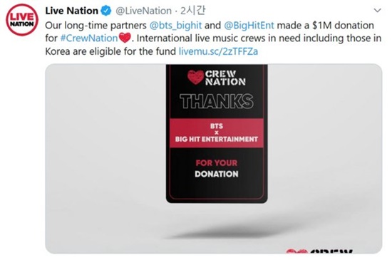 미국 공연 음악기업 '라이브네이션'에 따르면, 방탄소년단 측이 23일 전 세계 공연 스태프를 위한 기부 릴레이 '크루 네이션'에 100만 달러(한화 약 12억 원)을 기부했다.
