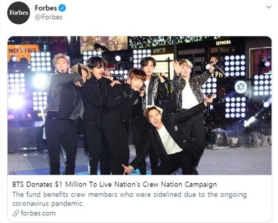 미국 경제 전문지 '포브스'도 방탄소년단의 기부 소식을 집중 조명했다. "방탄소년단 콘서트에서 일할 예정이던 스태프 70여 명이 현재까지 지원을 받았다"고 알렸다.