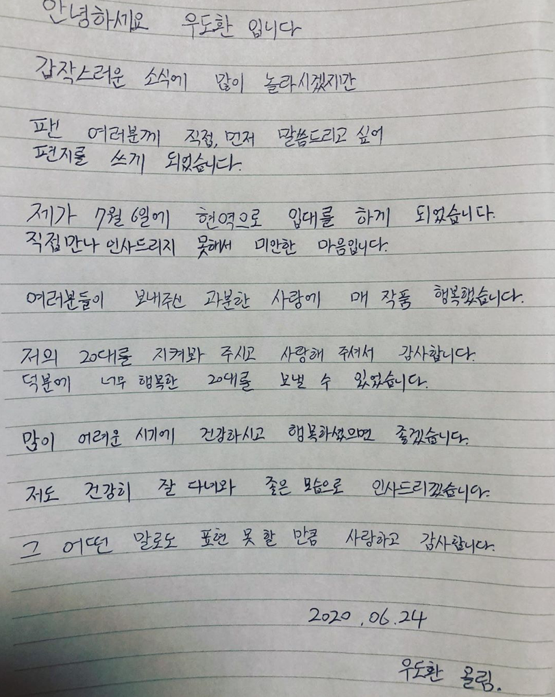 우도환은 이날 자신의 인스타그램에 손편지를 남겼다. “갑작스러운 소식에 많이 놀라셨겠지만, 팬 여러분께 먼저 말씀드리고 싶었다”고 말했다.
