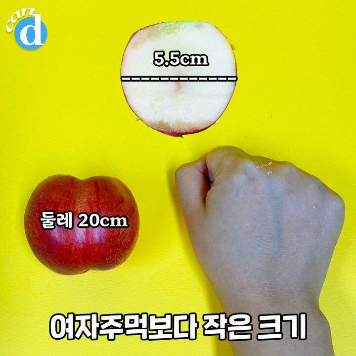 신비복숭아의 크기는 주먹보다 작아요. 반 갈랐을때 지름은 5cm 남짓. 한번에 2~3개는 거뜬해요.