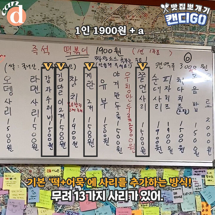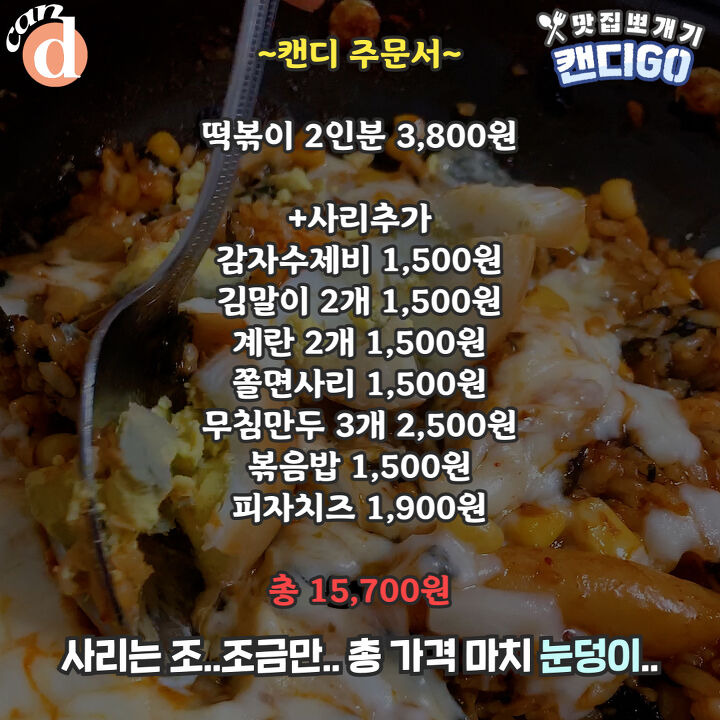 캔디의 주문서를 함께 들여다볼까요? 떡볶이 2인분 (1인 1주문)에 4가지 사리를 추가하고