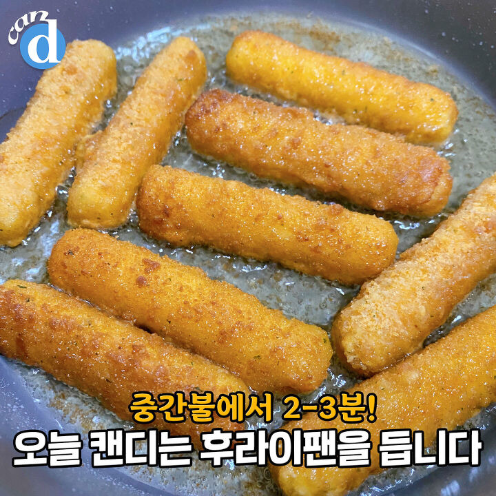 캔디는 오늘 후라이팬을 들었어요. 기름을 두르고 치즈스틱을 튀겨봅니다★ 중불에서 2-3분이면 충분해요. 치즈가 터지지 않게 잘 지켜봐주세요~