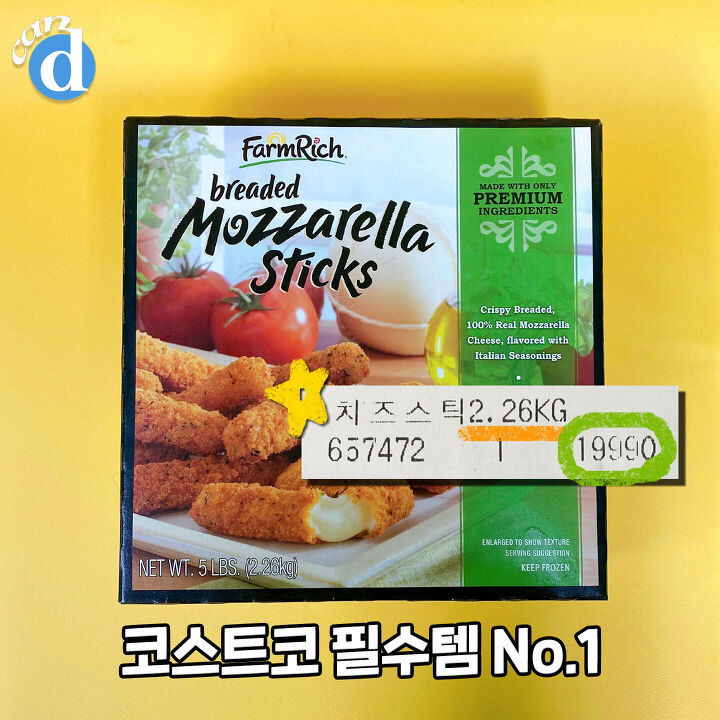 정식 이름은 '팜리치 브레디드 모짜렐라 치즈스틱'. 참 길죠? 그냥 코코표 치즈스틱으로...★ 무려 2.26kg이며 19,900원에 판매중이에요.