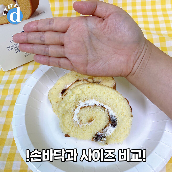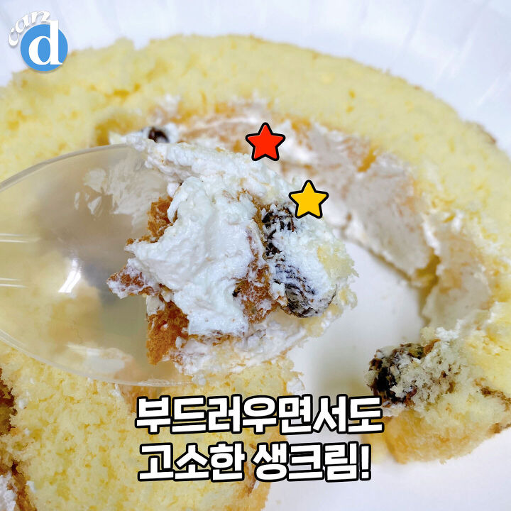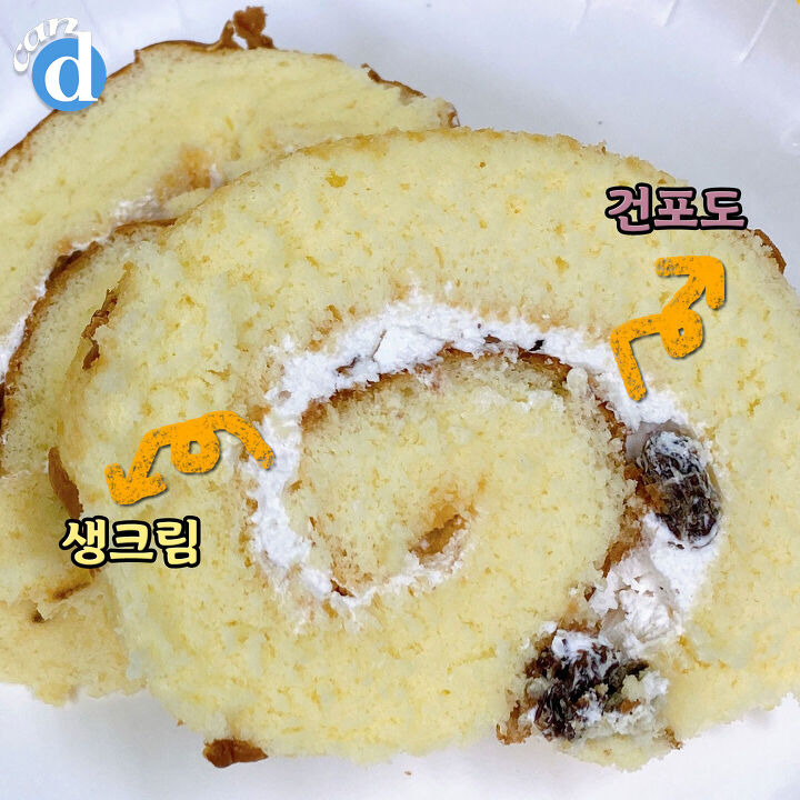 롤케익 안으로는 생크림과 건포도가 들어있어요. 겉보기에는 건포도가 1-2개밖에 없을 것 같은데! 한조각당 8~9개 정도로 듬뿍 들어있답니다.
