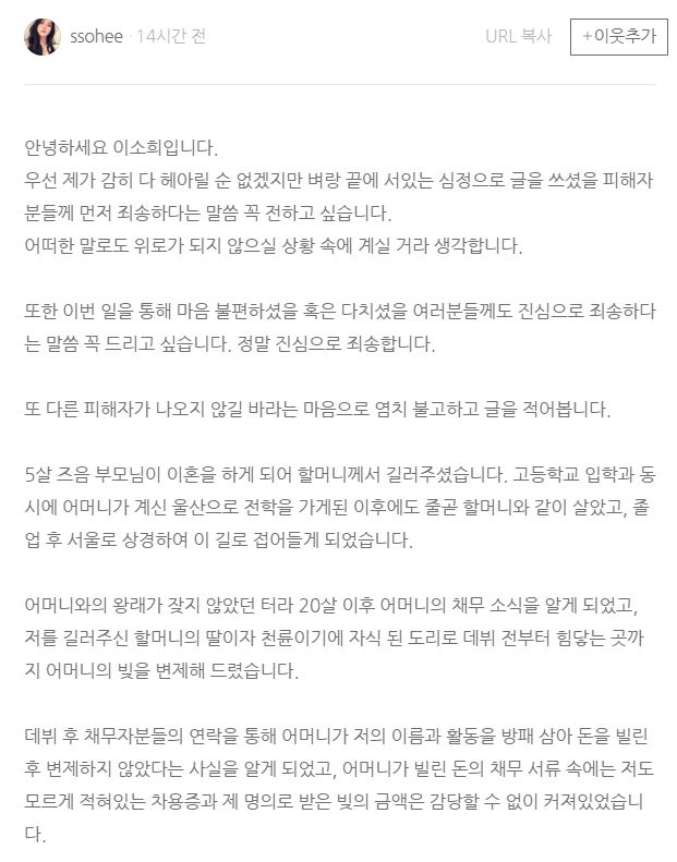 "그저 저의 어리고, 미숙한 판단으로 빚을 대신 변제해 주는 것만이 해결책이라고 생각했던 제 불찰로 인해 더 많은 피해자 분들이 생긴 것 같아 그저 죄송한 마음 뿐입니다." (한소희)