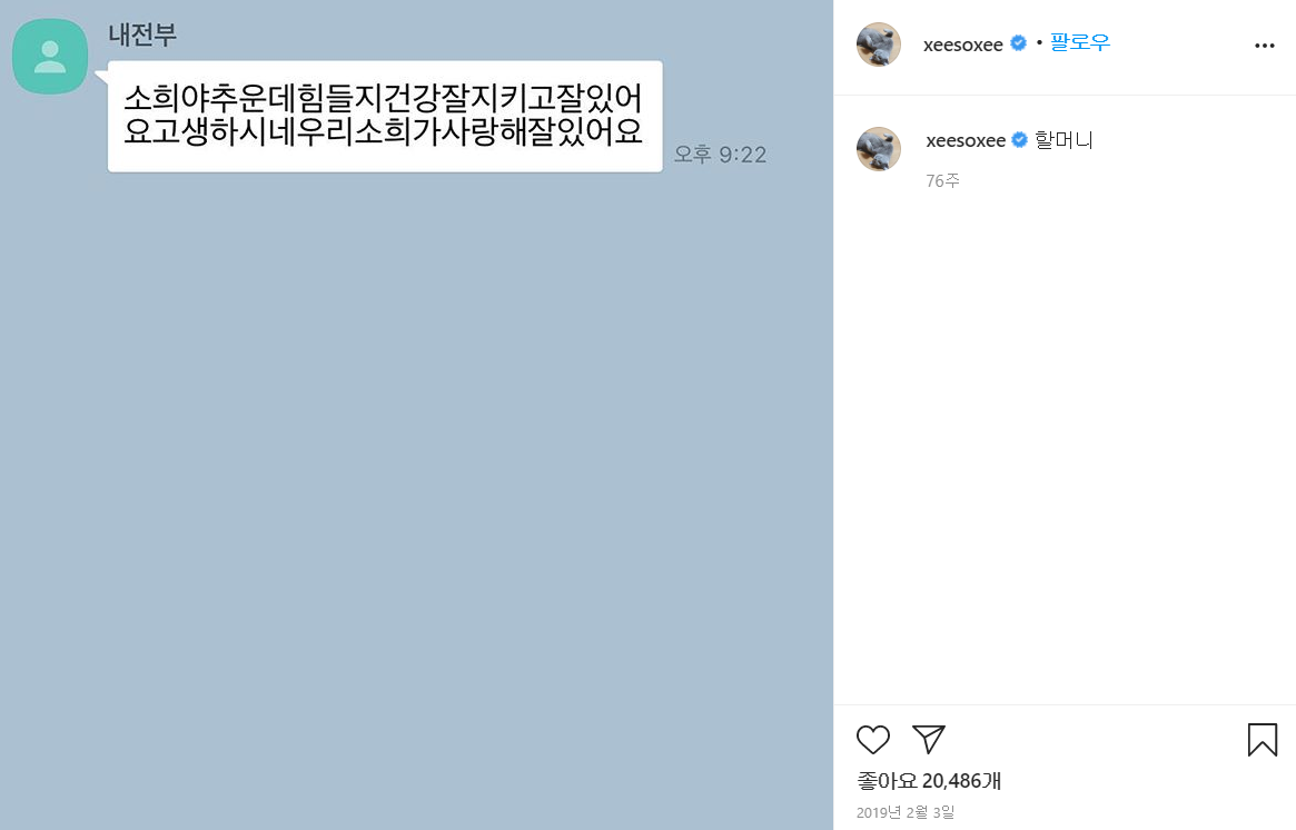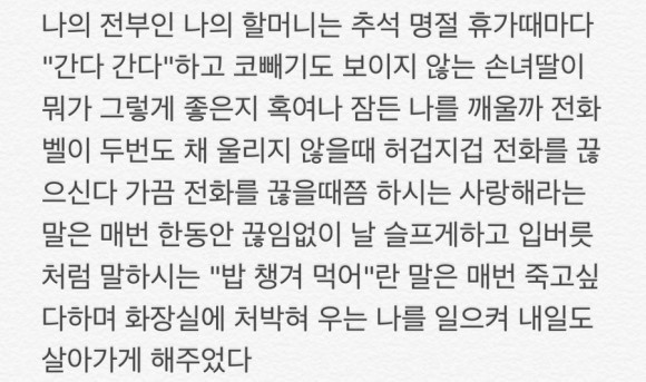 "나의 전부인 할머니는 혹여나 잠든 나를 깨울까 전화벨이 두 번도 채 울리지 않을 때 허겁지겁 전화를 끊으신다" (2019년 8월 31일, 한소희 블로그)