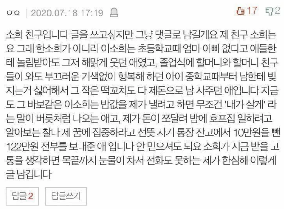 "소희 친구입니다. 제 친구 소희는요. 그래 한소희가 아니라 이소희는 초등학교 때 엄마 아빠 없다고 애들한테 놀림받아도 그저 해맑게 웃던 애였고, 졸업식에 할머니와 할머니 친구들이 와도 부끄러운 기색 없이 행복해 하던 아이. 중학교 때부터 남한테 빚지는 거 싫어해서 그 작은 떡꼬치도 다 제 돈으로 남 사주던 애입니다. 지금도 그 바보같은 이소희는 밥값을 제가 내려고 하면 무조건 '내가 살게'라는 말이 버릇처럼 나오는 애고, 제가 돈이 쪼달려 밤에 호프집 일하려고 알아보는 찰나 제 꿈에 집중하라고 선뜻 자기 통장 잔고에서 10만원을 뺀 122만원 전부를 보내준 애입니다. 소희가 지금 받을 고통을 생각하면 목끝까지 눈물이 차서, 전화도 못 하는 제가 한심해 이렇게 글 남깁니다." (2020년 7월 18일, 한소희 친구)
