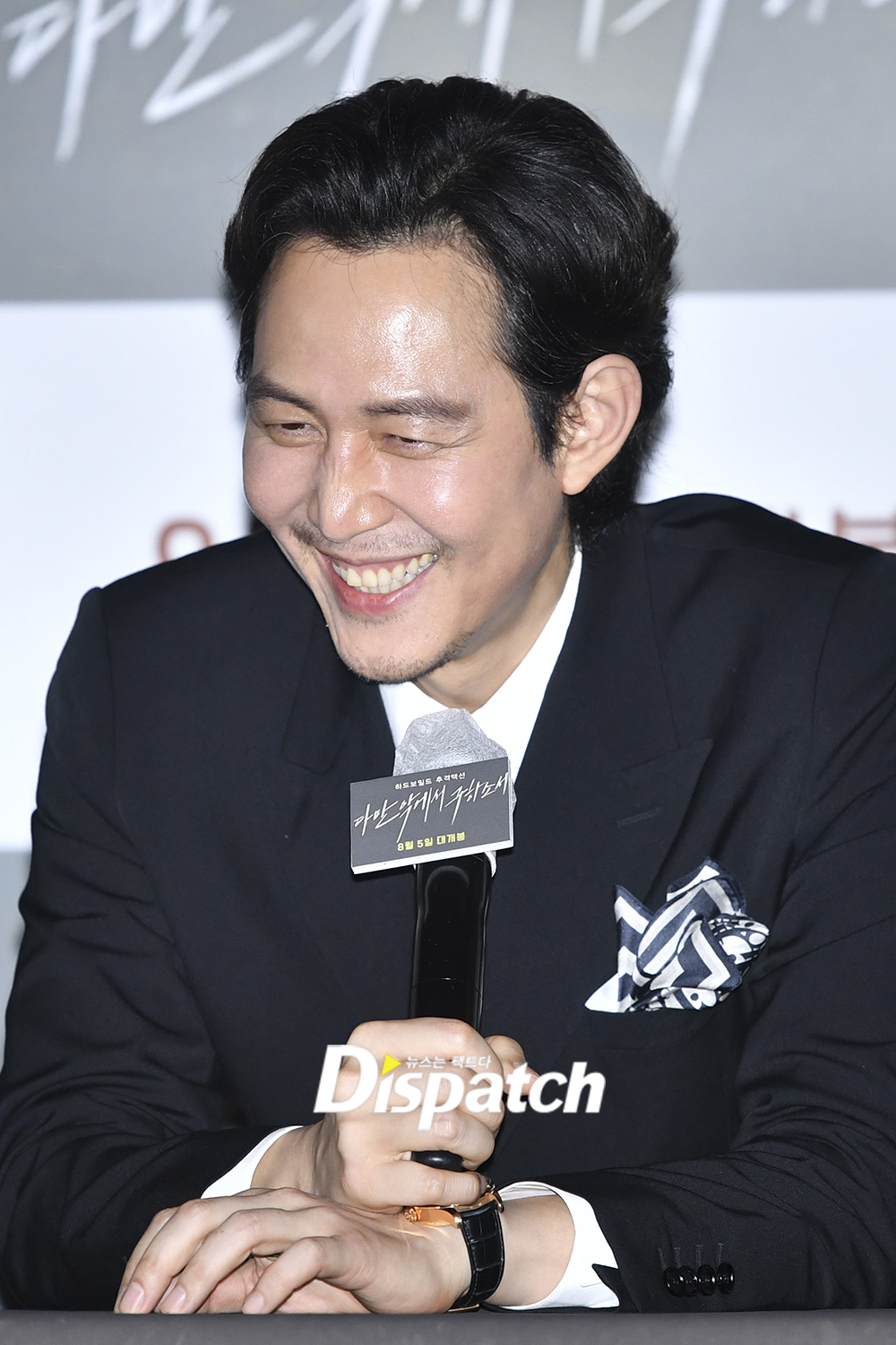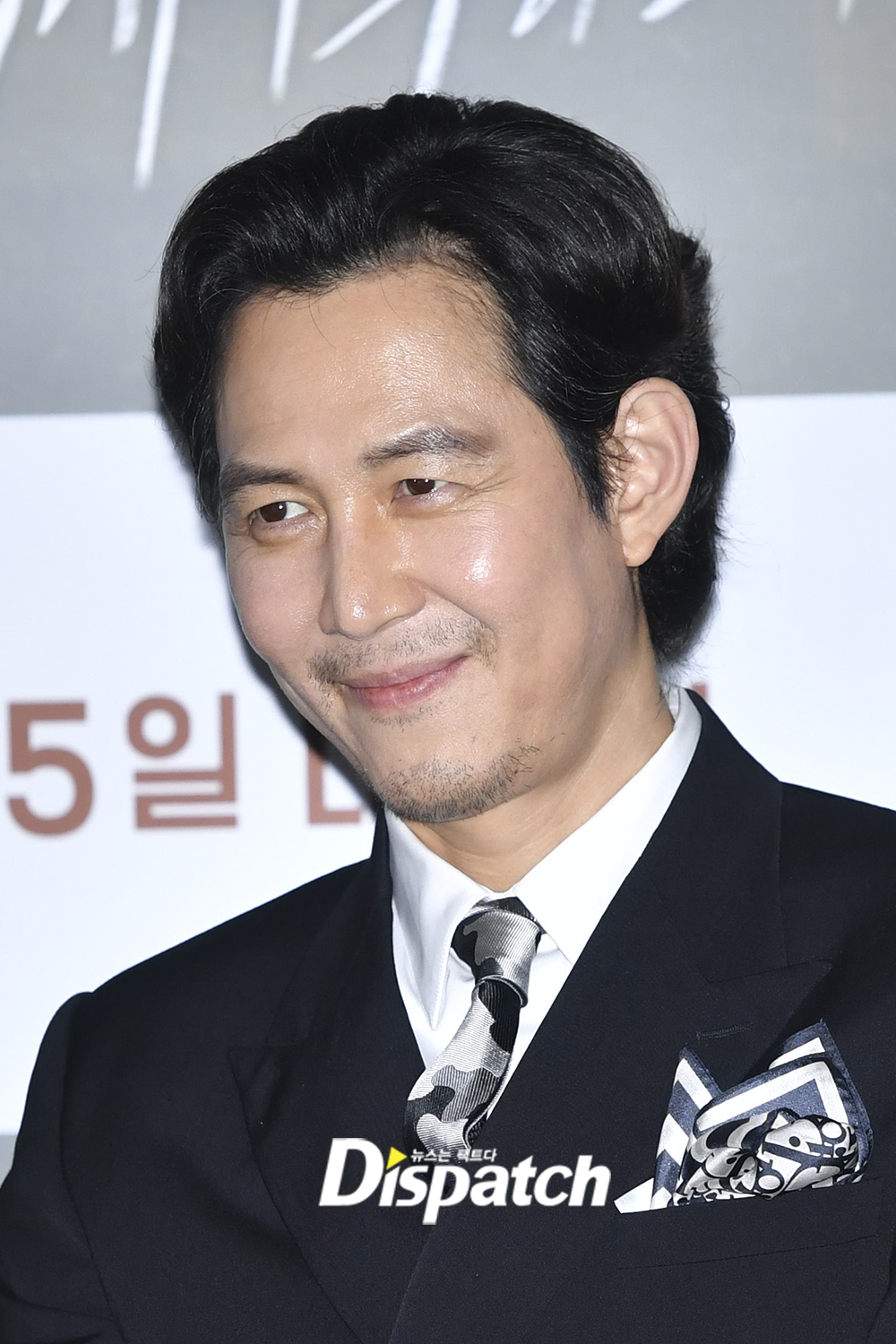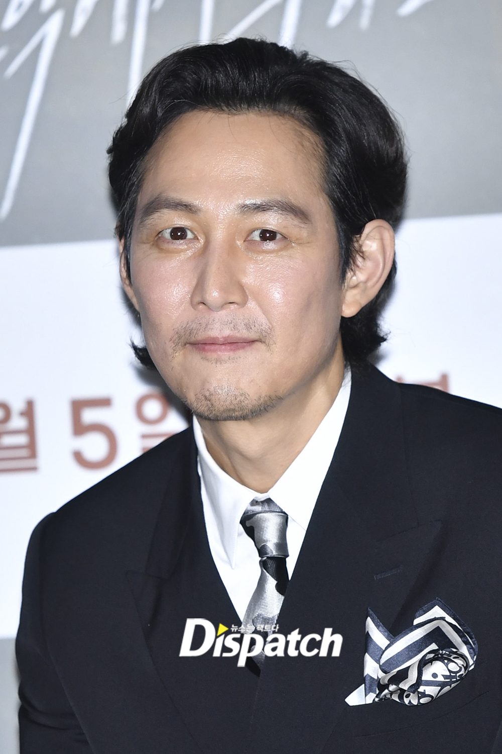 이정재는 이날 시크한 블랙 수트룩에 부드러운 미소로 취재진의 이목을 사로잡았다.