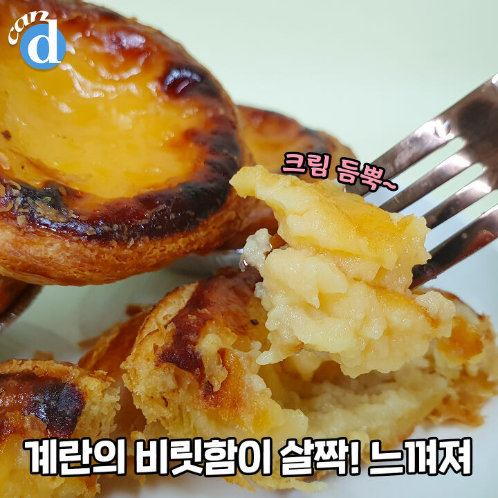 에그타르트를 반으로 자를 때, 커스터드크림의 달콤한 향기가 코끝을 찌릅니다.