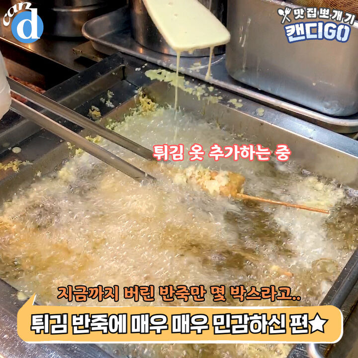 튀김이 겹겹이 쌓이는 게 아니라 바삭함을 더할 수 있도록 소량의 반죽을 추가로 떨어뜨리는 방식이었어요.