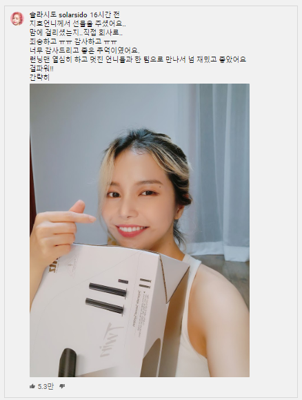 솔라가 지난 2일 자신의 유튜브 채널 ‘솔라시도 solarsido’ 커뮤니티에 “지효언니께서 선물을 주셨다. 마음에 걸리셨는지 직접 회사로 보내주셨다”라며 송지효에게 받은 선물을 인증했습니다.