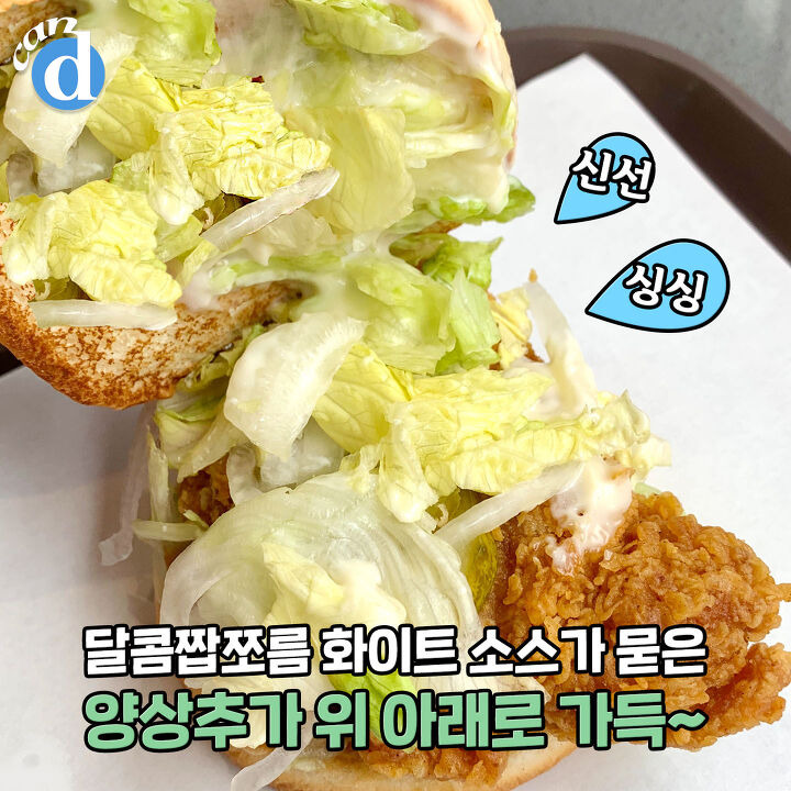 맨 위와 맨 아래에는 양상추가 가득 있어요. 달콤 짭쪼름한 화이트소스도 함께!