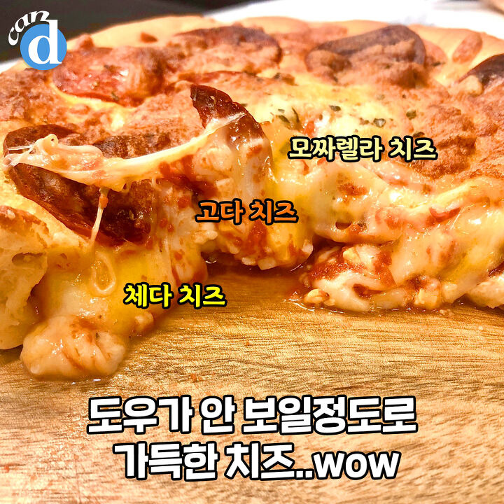 체다치즈, 고다치즈, 모짜렐라 치즈. 총 3종의 치즈가 한 피자에 총출동! 진한 풍미가 대박이에요.