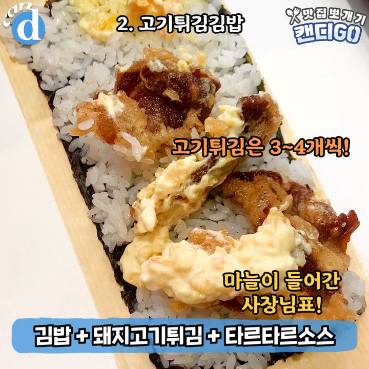 돼지고기 튀김이 통째로 들어간 이 김밥! 역시 고기의 짝꿍은 마늘이죠!