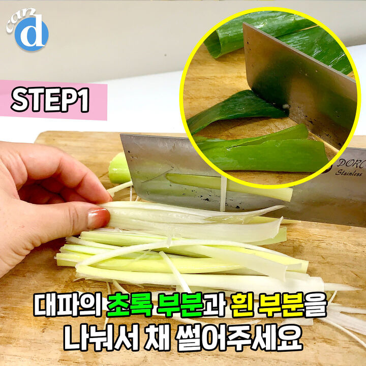 대파는 초록 줄기 부분과 흰 뿌리 부분을 나눠서 채 썰어줍니다.